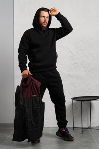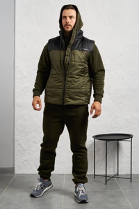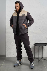 Костюм складається з утепленого жилета та зручного теплого спортивного комплекту. Худі з капюшоном і кишенею-кенгуру, збоку декороване нашивкою, рукава завершені манжетами. Штани прямого крою з високою посадкою, мають кишені та знизу зібрані на гумку. Жилет стьобаний на синтепоні, з підкладкою з плащової тканини, застібається на блискавку, оснащений двома бічними кишенями та декорований нашивкою на грудях.