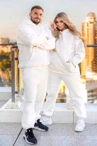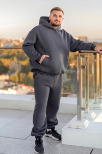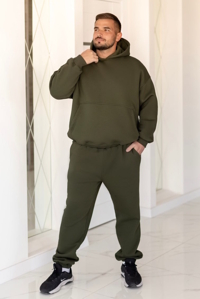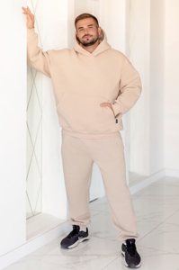 Худі з подвійним капюшоном, дві кнопки для його фіксації, манжети рукавів на резинці, спереді накладна кишеня кенгуру. Джогери на виоскій посадці, пояс на резинці та шнурку, понизу виробу манжети на резинці.