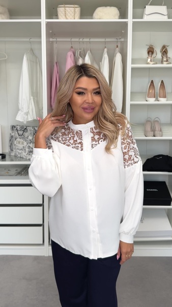 Головною окрасою виробу є ніжні вставки з вишивки, розташовані на грудях та рукавах, що додають дизайну особливого шарму. Блуза має акуратний округлий комір і зручно застібається на ґудзики по всій довжині. Довгі просторі рукави акуратно зібрані на манжети, які також фіксуються ґудзиками, формуючи красивий, злегка об'ємний силует.