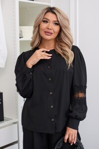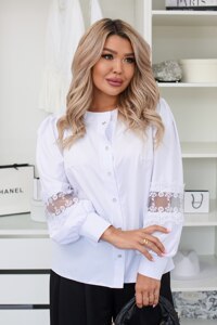 Верх виробу оформлений лаконічним округлим коміром. Блуза зручно застібається спереду на планку з рядом акуратних ґудзиків. Головним романтичним акцентом дизайну є довгі вільні рукави, вишукано оздоблені вставками з ніжного мережива. Вони завершуються класичними манжетами, які надійно фіксуються на ґудзик, створюючи красивий, злегка об'ємний силует.