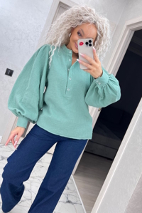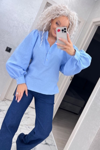 Вишукана блузка із комірцем-стійкою на п'ять функціональних ґудзиків. Легкий об'ємний рукав на манжеті. Муслін має переваги в легкості, практичності та дуже гарному зовнішньому вигляді.