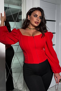 Елегантна ошатна блузка-корсет, зшита з якісної костюмної тканини, що забезпечує ідеальну посадку та гарне тримання форми. Модель має приталений крій з рельєфними швами, що імітують корсет, ідеально підкреслюючи талію та груди. Квадратний виріз горловини візуально витягує шию.