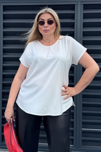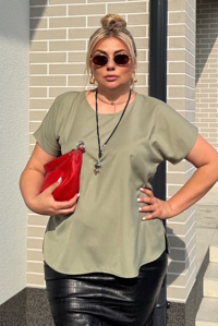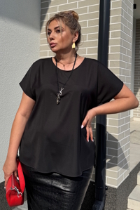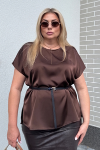 Благородна тканина легка та невагома на тілі, не парить. Силует вільний, горловина лодочка, по боках розрізи.