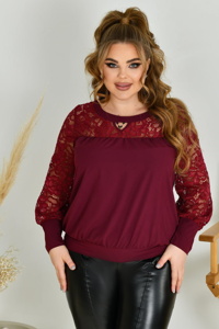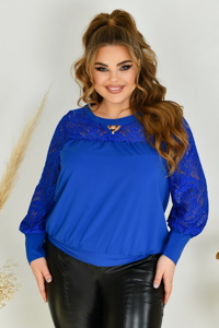Круглий виріз горловини прикрашений оригінальною біжутерією, що додає моделі елегантності. Об’ємні рукави з гіпюру оформлені манжетами без розтяжності. Блуза з напуском, без кишень і застібок, виглядає легко та гармонійно.