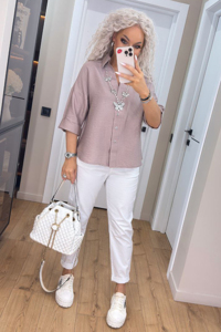 Натуральність лляної тканини надає образу особливого шарму та вишуканості. Модель має класичний комірець, рукави довжиною ¾ з вільними манжетами. Виріб застібається на ґудзики.
