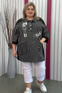 Лінія плеча приспущена, рукав широкий на манжеті. На грудях розміщена застібка на ґудзики. По грудях оверсайз. Прикрашена якісним накатом. З боків розміщені накладні кишені. Доповнити можна вузькими штанами, лосинами чи джинсами.