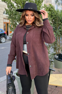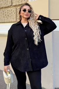 Стильна жіноча сорочка з вельвету. Вона має вільний крій оверсайз, що додає образу комфорту та стилю. Модель застібається на великі ґудзики спереду й має комір класичного типу. Тканина з вираженою фактурою «рубчик», характерною для вельвету, робить річ більш цікавою й об’ємною.