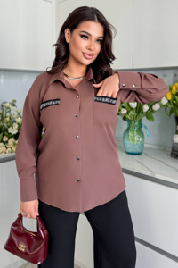 Модель має довгі рукави з манжетами, які застібаються на ґудзики, а також класичний відкладний комір. Спереду є ряд ґудзиків для застібання, які дозволяють носити виріб як у застебнутому, так і в розстібнутому вигляді. Прикрашена модель стразами на кишенях. Ця сорочка ідеально підходить для створення як повсякденних, так і офіційних образів, залежно від обраного поєднання з іншими елементами гардеробу.