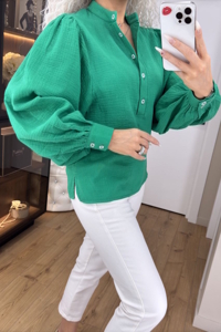 Вишукана блузка із комірцем-стійкою на п'ять функціональних ґудзиків. Легкий об'ємний рукав на манжеті. Муслін має переваги в легкості, практичності та дуже гарному зовнішньому вигляді.
