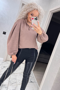 Вишукана блуза з комірцем-стійкою. Застібається на три функціональні ґудзики у формі квадрата з золотою оправою.