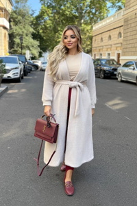 Подовжений кардиган на запах із витонченим силуетом. Талія регулюється та фіксується канатом, а рукави доповнені акуратними манжетами, що забезпечують комфорт і завершений вигляд.