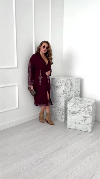 Деталі: подвійна гладка в'язка з узором на рукавах та по полочці в національному стилі, довжина нижче коліна, довгий рукав. Модель чудово доповнить будь який образ: і брюки і спідницю і плаття.