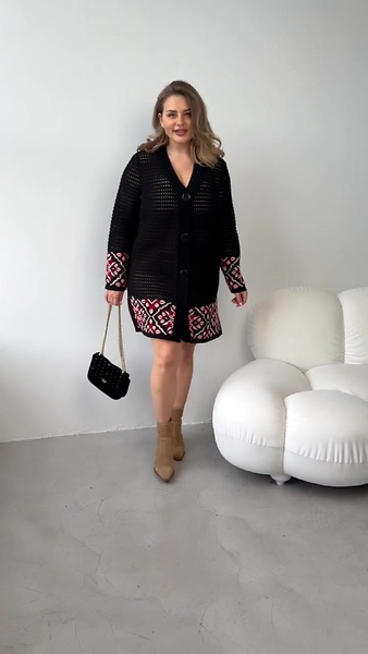 Модель застібається на три масивних гудзика, прямий силует, V-подібний виріз, довгий рукав. Ізюминкою моделі служать в'язані елементи в етностилі.
