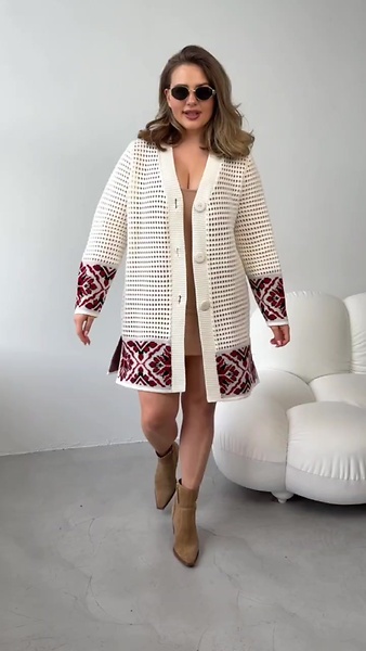 Модель застібається на три масивних гудзика, прямий силует, V-подібний виріз, довгий рукав. Ізюминкою моделі служать в'язані елементи в етностилі.