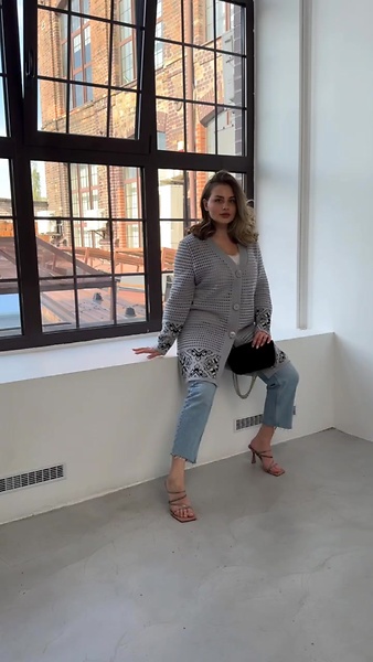 Модель застібається на три масивних гудзика, прямий силует, V-подібний виріз, довгий рукав. Ізюминкою моделі служать в'язані елементи в етностилі.