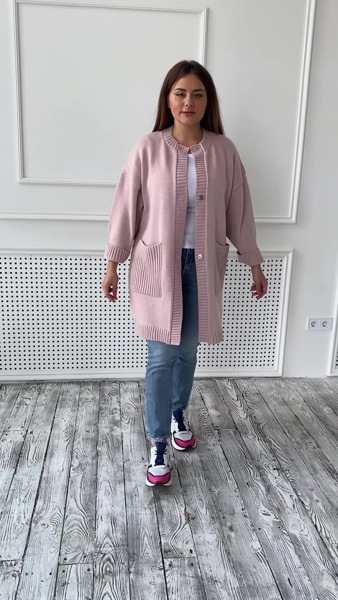 Благородний жіночий в'язаний кардиган прямого крою з мініатюрним коміром стійкою.