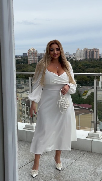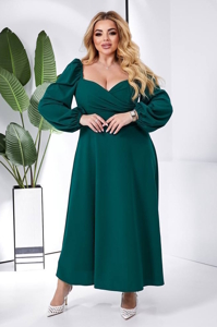Глибокий виріз горловини, ліф виконаний назапАх. Рукав ліхтарик, основа на резинці, довжина 3/4. По спинці потайна блискавка.