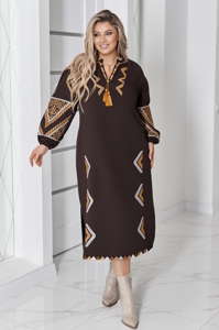 Вишукане плаття вільного крою гарно розшите вишивкою в етно стилі по всій площі спереду, на рукавах та знизу. На шиї невеличкий виріз на зав'язці у колір вишивки.