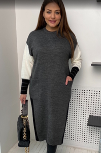 Силует прямий, накладні кишені, довжина міді. Плаття комбіноване в трьох гармонійних кольорах. Преміум якість.