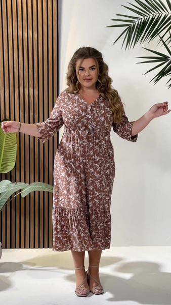 Сукня має розслаблений трапецієподібний крій із завищеною лінією талії, яку зручно акцентувати за допомогою вшитої куліски. Витончений V-подібний виріз горловини доповнений центральною планкою з рядом функціональних ґудзиків. Просторі рукави довжиною 3/4 акуратно зібрані на еластичну резинку для створення гармонійного та злегка об'ємного силуету.