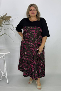 Нижня частина сукні (спідниця) має вільний, трапецієподібний крій (А-силует). Об'ємний квітковий малюнок на джерсі у контрастних кольорах надає моделі особливої вишуканості та святкового акценту. Цей виріб чудово підійде для створення елегантного та виразного образу для урочистих подій, зустрічей або як стильний повсякденний варіант.