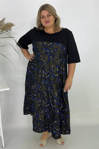 Стильна ошатна сукня, зшита з комбінації двох контрастних матеріалів: верх виконаний із гладкої двонитки, а нижня частина – із трикотажу джерсі з об'ємним малюнком. Верх плаття має вільний крій з округлим вирізом горловини та короткими рукавами, забезпечуючи комфортну посадку.