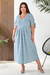 Легка та елегантна сукня міді з ніжним квітковим принтом – ідеальний вибір для теплого сезону. Модель має V-подібний виріз горловини та короткі рукави, які зав'язуються на декоративні бантики.