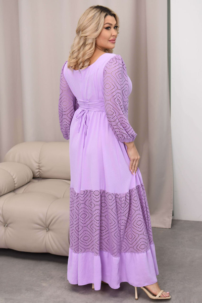 Розкішне плаття максі довжини – чудовий варіант для створення святкових образів. Модель виготовлена з натуральної легкої тканини – крепу-жатки. Квадратний виріз декольте підкреслює красу жіночих форм. На трьохчетвертних рукавах та на спідниці виробу розміщена перфорація. Внизу сукня прикрашена воланом.