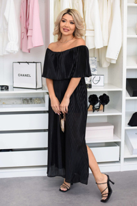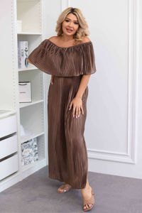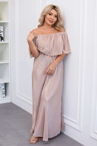 Розкішне плаття чудово підійде для вечірніх образів. Модель максі довжини підкреслить витонченість. Виріб виготовлений з тканини плісе. Виріз горловини спокусливо оголює плечі.