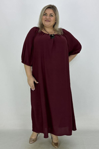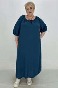 Довге плаття вільного крою. Насичений колір виглядає елегантно та шляхетно. Фасон виробу «балахон» забезпечує максимальний комфорт і приховує форми. Максі довжина створює елегантний і витончений силует. Горловина зібрана на резинку. Рукави об'ємні довжиною трохи нижче ліктя. Вони також зібрані на резинку по краю, створюючи легкий об'єм.