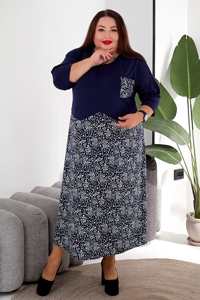 Привнесіть свіжість і стиль до свого гардероба з нашою комбінованою сукнею великих розмірів, ідеальним вибором для жінок з пишними формами. Верхня частина сукні виконана в глибокому синьому відтінку, надаючи образу елегантності та вишуканості, в той час як нижня частина прикрашена модним синім патерном на білому тлі, додаючи вбранню яскравого акценту і стильного штриха.