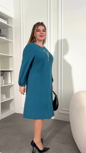 Модель виконана з напівкруглим широким вирізом горловини та діагональними виточками на грудях, що формують силует. У бокових швах розміщені зручні кишені. Рукави вільного крою, зібрані на зап’ястках м’якою резинкою без манжетів. Сукня не має застібок.