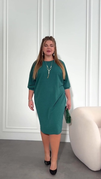 Вільний крій у стилі «летюча миша» додає сукні легкості та робить образ акуратним і елегантним. Модель має рукава 3/4 та довжину по коліна. Основа сукні однотонна.
