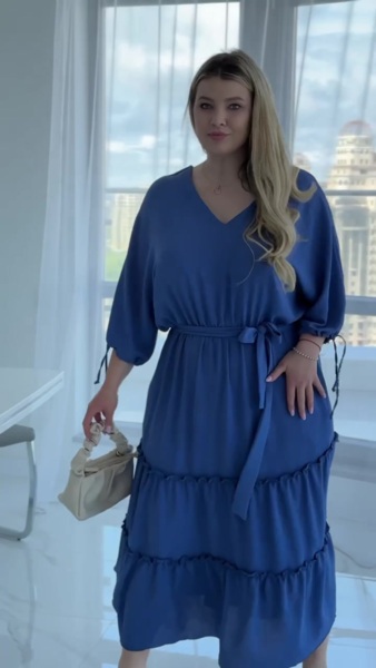 Основа сукні однотонна, що є трендом цього сезону. На грудях і спині з V-подібним вирізом, талія - на гумці з поясом, рукав кажан на зав'язках. По довжині сукня - максі.