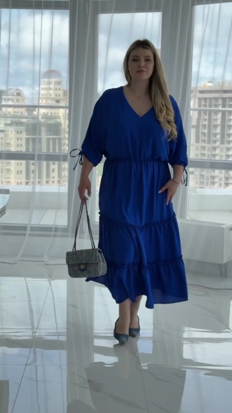 Основа сукні однотонна, що є трендом цього сезону. На грудях і спині з V-подібним вирізом, талія - на гумці з поясом, рукав кажан на зав'язках. По довжині сукня - максі.