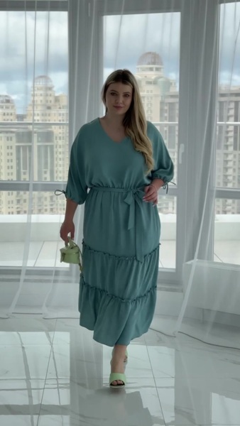 Основа сукні однотонна, що є трендом цього сезону. На грудях і спині з V-подібним вирізом, талія - на гумці з поясом, рукав кажан на зав'язках. По довжині сукня - максі.