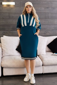 Сукня оригінального вільного крою з білими вставками та блискавкою на грудях, доповнена коміром-стійкою. У рельєфних швах попереду розташовані кишені, по спинці модель має вільний силует, а з боків — розрізи. Низ виробу спереду та манжети рукавів ¾ оздоблені рібаною. Надзвичайно стильна й ефектна сукня, яка вдало підкреслить ваш індивідуальний образ!