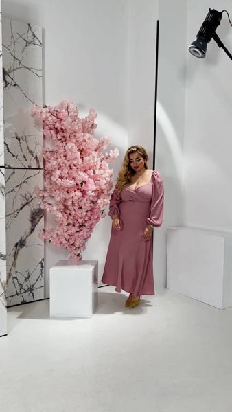 Глибокий виріз горловини, ліф виконаний назапАх. Рукав ліхтарик, основа на резинці, довжина 3/4. По спинці потайна блискавка.