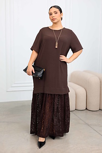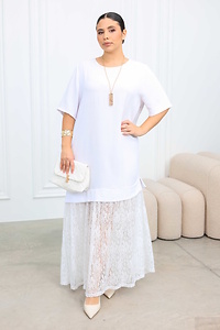 Модель вирізняється оригінальним міксом стилів і текстур: верх виконаний у форматі вільної футболки з коротким рукавом, що дарує відчуття легкості та зручності. У бічних швах — практичні кишені. Нижня частина сукні — витончена гіпюрова спідниця, яка додає образу ніжності й вишуканості.