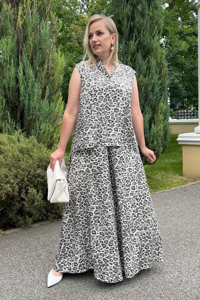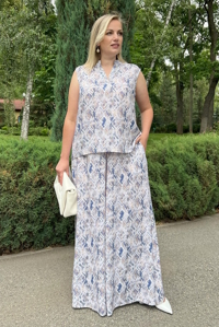 Блуза вільного фасону, без рукавів, з вирізом. Брюки- спідниця дуже вільного силует, пояс на резинці, по боках кишені.