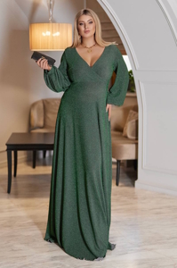 Вишукане вечірнє плаття А-силуету максі довжини. Довгі рукави моделі внизу на манжетах.