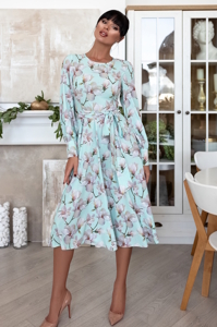Сама сукня доповнена поясом, який наче розділяє її верхню частину та саму спідницю плаття. Чудовим виконанням в даному виробі є рукава, які закінчуються манжетами ( цей елемент створює відчуття вишуканості та наявності витонченого смаку).
