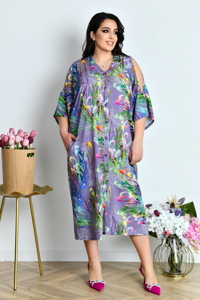Приспущений рукав "летюча миша" з розрізами. Виріз V-подібний, в бокових швах кишені, довжина нижче коліна.