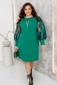 Плаття виконане в прямому силуеті та з блискавкою, яка розташова на спинній частині виробу. Манжети на рукавах прикрашають стильні гудзики. Така модель неодмінно стане Вашою улюбленицею для свят різного типу та масштабу. Прикраса що на моделі також входить до комплекту.