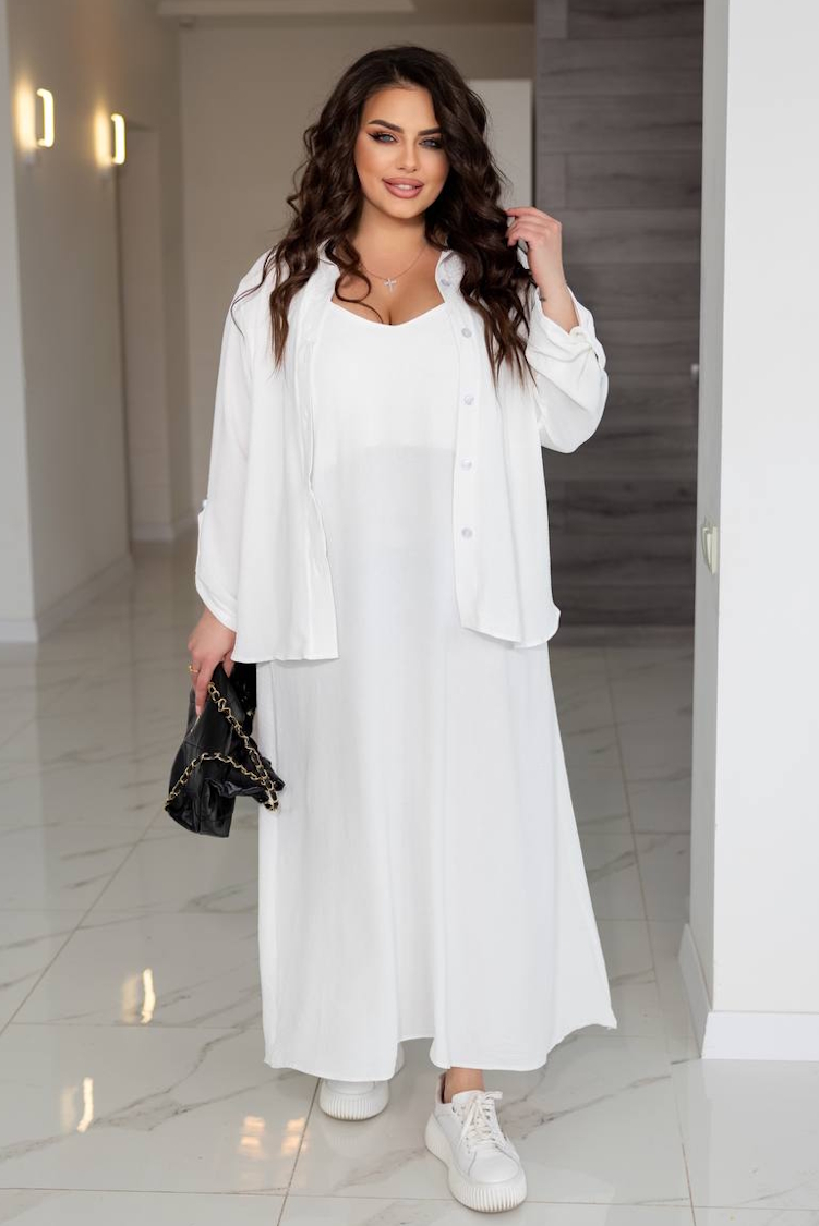 Сорочка на ґудзиках, рукав регулюється прихованим патіком на ґудзику, варіант довгий та укорочений рукав. Сарафан на брителях з регуляторами.