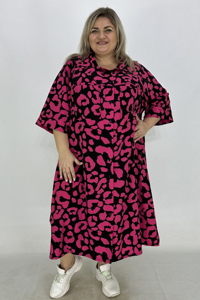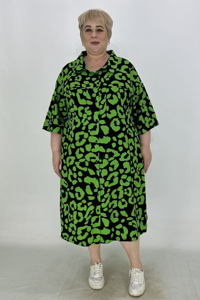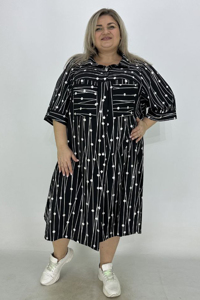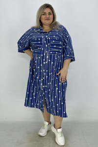 Плаття-сорочка вільного крою довжини міді. Фасон виробу забезпечує максимальний комфорт і приховує форми. Класичний відкладний комір, застібка на ряд ґудзиків. Рукави широкі, довжиною трохи нижче ліктя. На грудях розташовані накладні кишені.