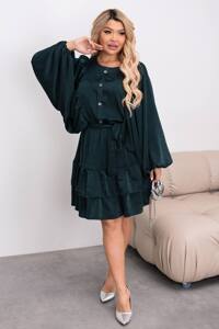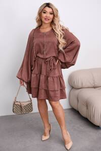Романтичне коротке плаття, виконана з легкої, трохи блискучої тканини. Вільний фасон, з акцентом на талії завдяки поясу-стрічці. Довгі рукави, широкі, вільно спадають, надаючи образу романтичності та легкості.