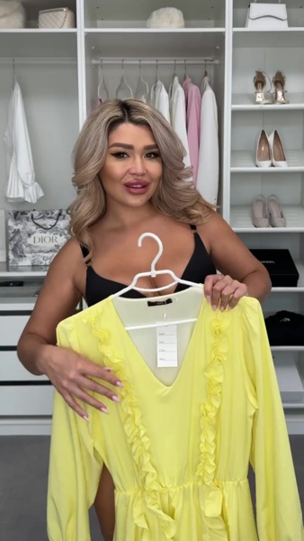 Жіночне плаття має вільний, трохи розкльошений крій до колін. Виготовлене з легкої летючої тканини. Прикрашене рюшами спереду (вздовж лінії V-подібного вирізу та по спідниці).
