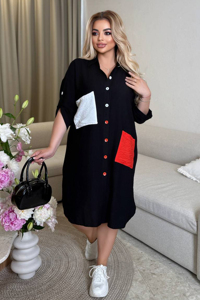 Застібка – це ряд ґудзиків, спереду накладні функціональні кишені. По боках невеликі закруглені вирізи, рукав можна підняти патиком. Сукня дуже жіночна та ідеально підходить для літньої прогулянки або відпочинку.