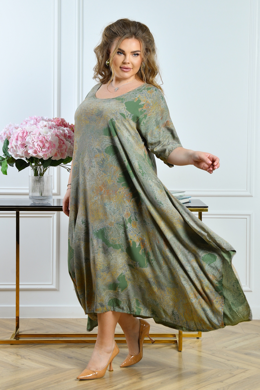 Плаття дуже вільного фасону, з боковими фалдами, рукав суцільний довжиною до ліктя. При потребі надамо відео, фото важко передає силует моделі.